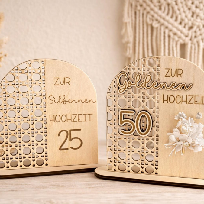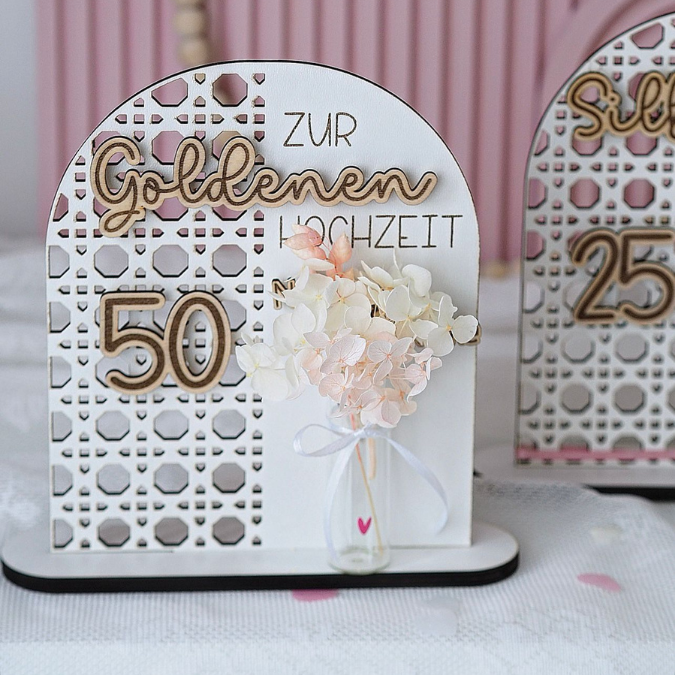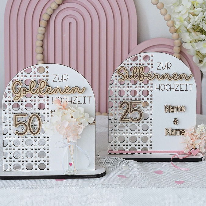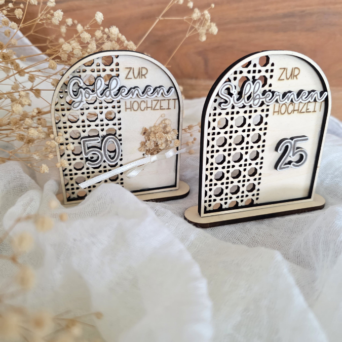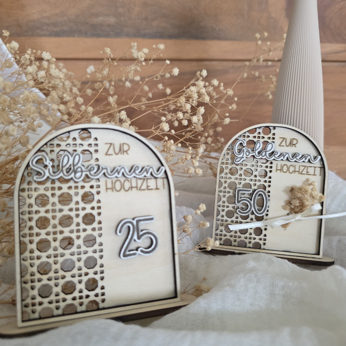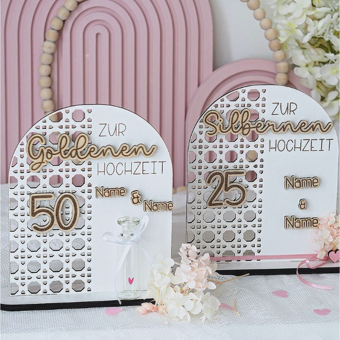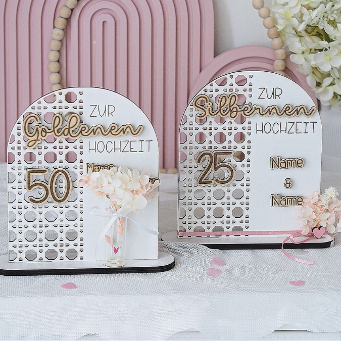 SVG Laserdatei Aufsteller Silberhochzeit und Goldhochzeit 25 Hochzeit 50 Jahre verheiratet rattan optik Geldgeschenk Hochzeitsgeschenk personalisierbar 3mm 4mm