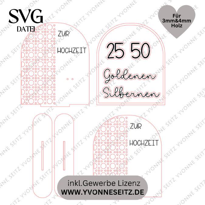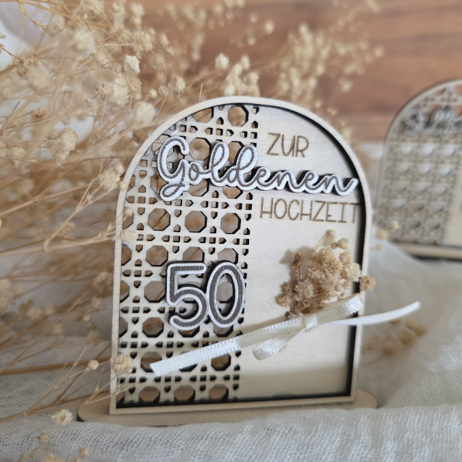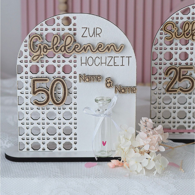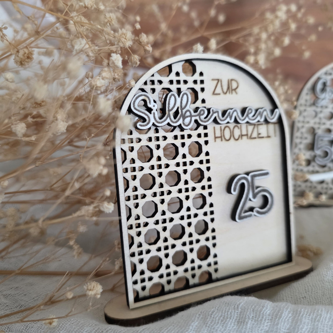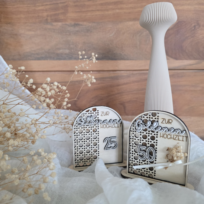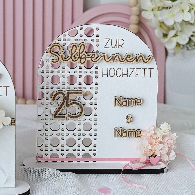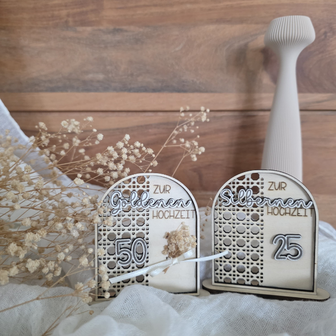 SVG Laserdatei Aufsteller Silberhochzeit und Goldhochzeit 25 Hochzeit 50 Jahre verheiratet rattan optik Geldgeschenk Hochzeitsgeschenk personalisierbar 3mm 4mm